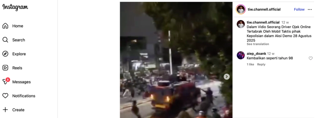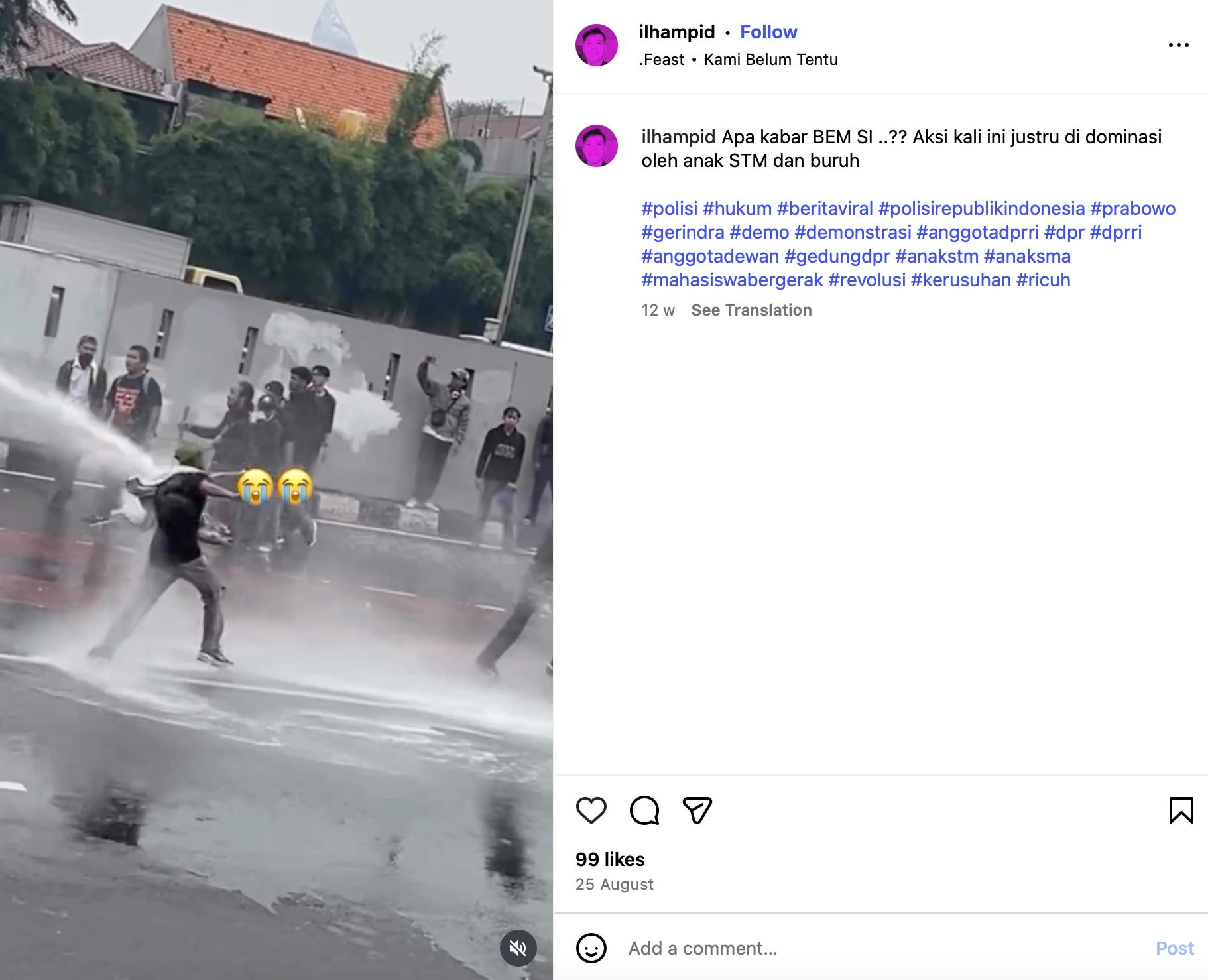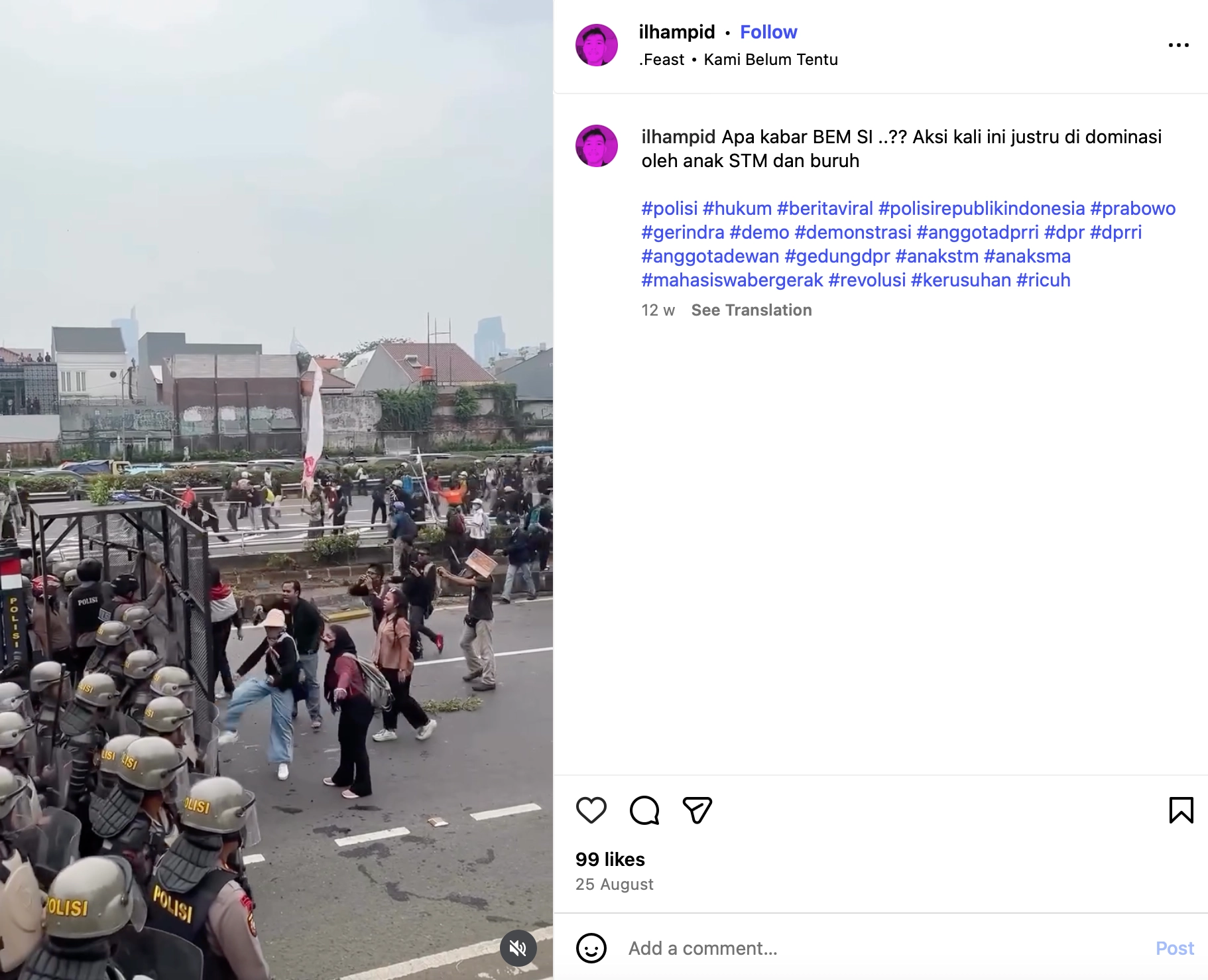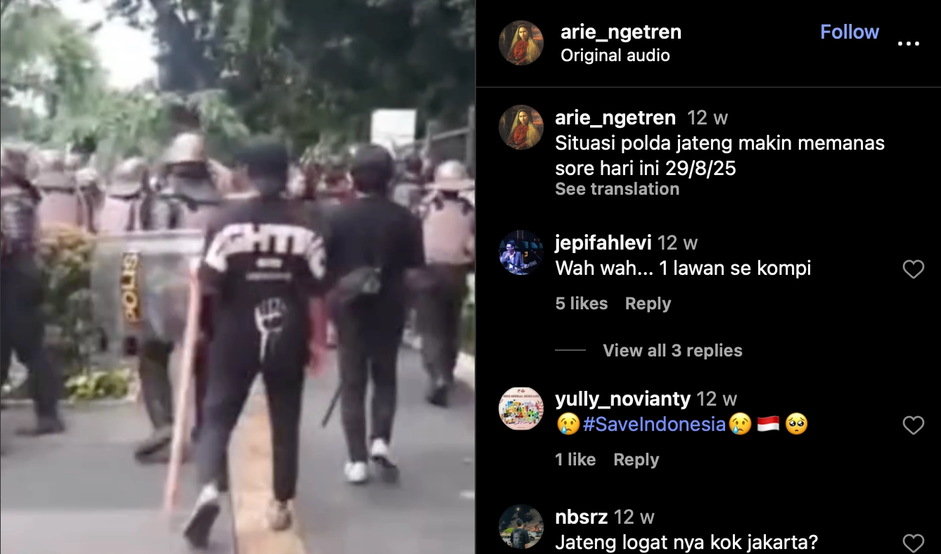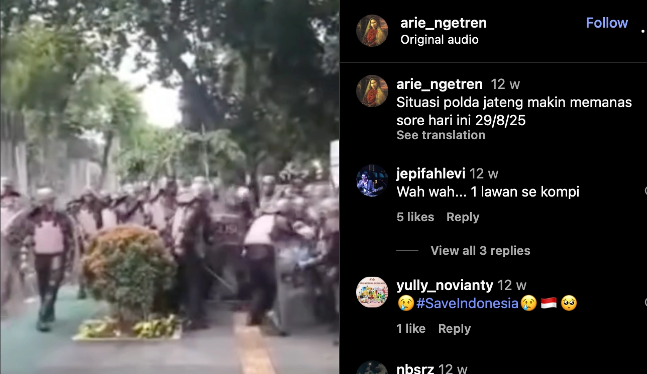 On the 29th, a video on Instagram shows protesters can be seen running away while a group of "Brimob" riot police charge in and beat up whoever they managed to corner. One post mentions “Pola Jateng” which is an abbreviation of the Central Java Regional Police.
