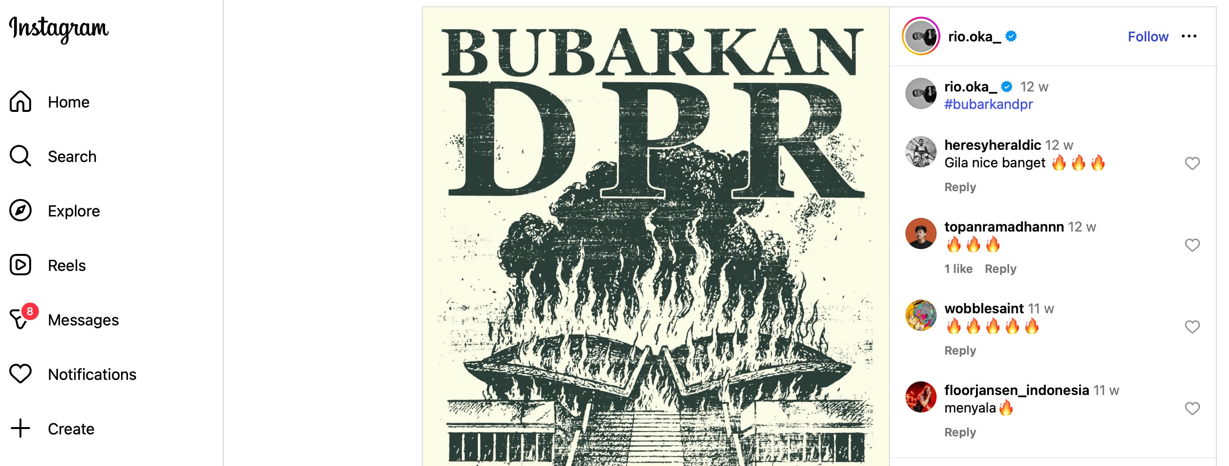 The #BubarkanDPR or #Dissolve Parliament shows a mixture of mostly very disgruntled content by supposedly Indonesian nationals frustrated with the state of their political system. For Instagram content try site:instagram.com " BubarkanDPR” on Google.