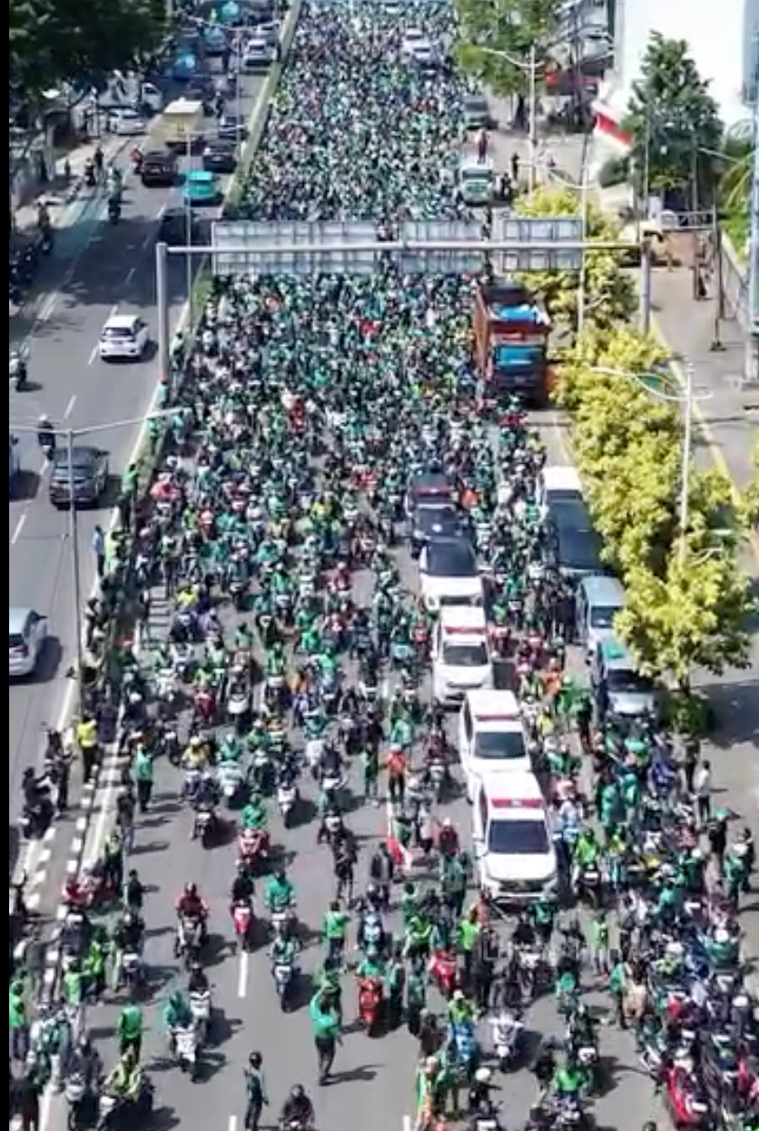 Still on the 29th, a very large group of motor vehicle drivers, mostly in green, appear to carry the body of the deceased Affan, according to the post’s description.