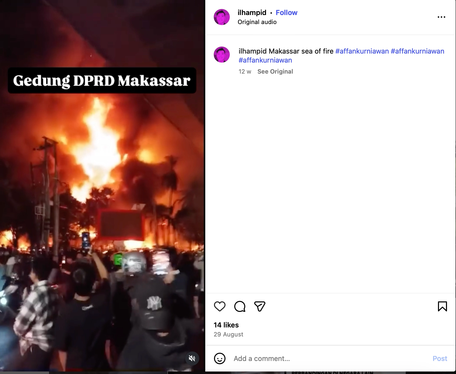 The same profile, a few days later, posted a video of a large crowd standing outside with a large building going up in a violent fire. The text Makassar stands out. A search query of “protes” AND “Makassar” quickly finds an explainer by the Guardian, noting that the building houses the regional parliament/city council. The video was shared on social media from various angles.